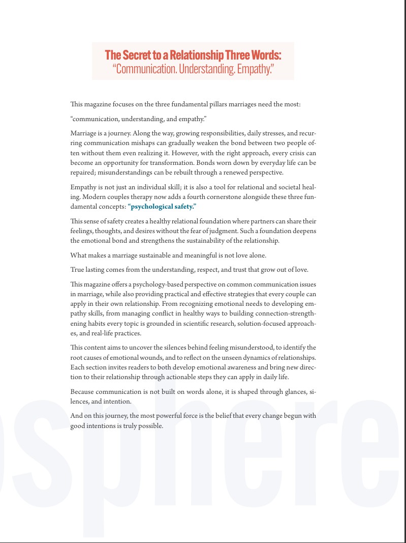 Bu dergi, yalnızca kelimelerle yazılmış bir yayın değil; bir çağrı, bir yolculuk ve bir hatırlayış. Farklı kültürlerden, farklı hikâyelerden gelen insanlar; ortak bir niyetle, ortak bir duyguda buluştu: “İyileştirmek. Anlamak. Yol göstermek.” Bugün ilişkilerimiz, her zamankinden daha fazla sınanıyor. Yakınlık yerini sessizliğe, sohbet yerini ekranlara bırakıyor. Ama içimizde hâlâ yankılanan o güçlü ihtiyaç var